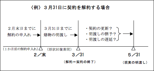 そもそも本件の契約は、法的には、借主の主張どおりの解約申入れがあったとすれば、借主が解約の申入れをした日の1か月後の期間満了日をもって契約は解消され、終了するわけであるから、借主は、その契約の終了までの間に、建物を原状に復し、明け渡さなければならないのである。したがって、契約が終了したあとの2か月間というのは、貸主が明渡しを猶予するという同意をしない限り、借主の「明渡し遅延」ということになるのである。そうなれば、約定いかんによっては、借主が賃料の倍額以上の違約金を貸主に支払うというようなケースも稀ではないのである。