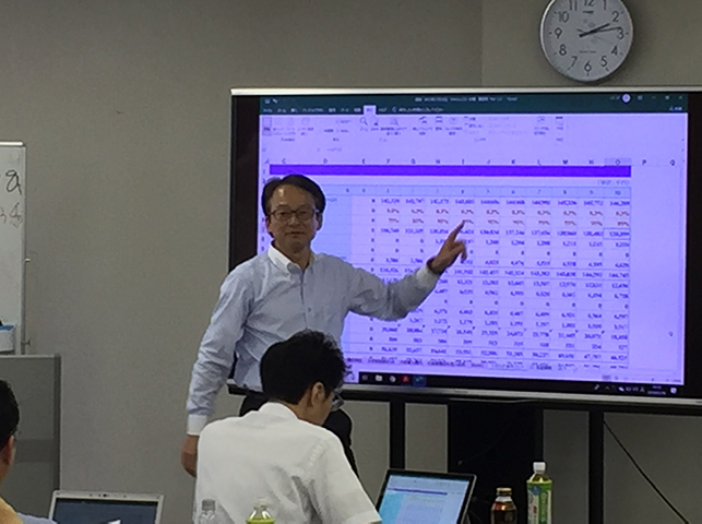 事業提案に際し、個別プロジェクトごとに異なる前提や手法を論理的に比較考量するため収支計算に必要な項目を取捨選択、プログラムをカスタマイズするなど実践で使える力を養うことを目的にし、当日は19人の専門士にパソコン持参で参加いただき、「建築ボリューム計算」、「収支計画作成」、「投資分析」をテーマに簡単な事業収支と投資分析プログラムを実際に作りました。